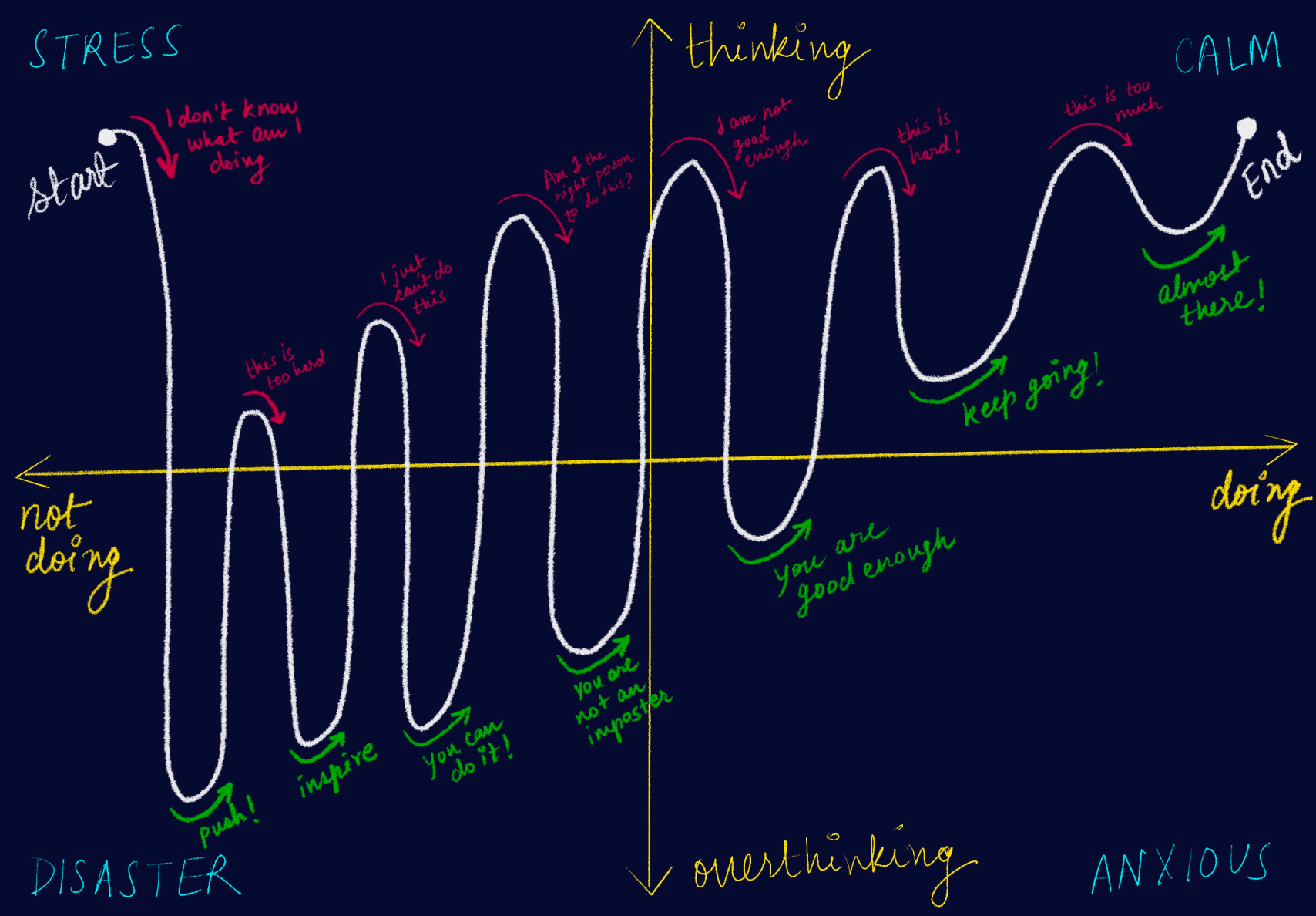 This postcard is rather a personal view into my individual process of how motivation and demotivation can be balanced while engaging in the process. Sometimes inspiring oneself is important to push through and get towards your goal. Discouragement is inevitable but inculcating in yourself the strength to keep going is important and is a skill that needs to be learned to not only engage in a process efficiently but to push through to achieve the result.