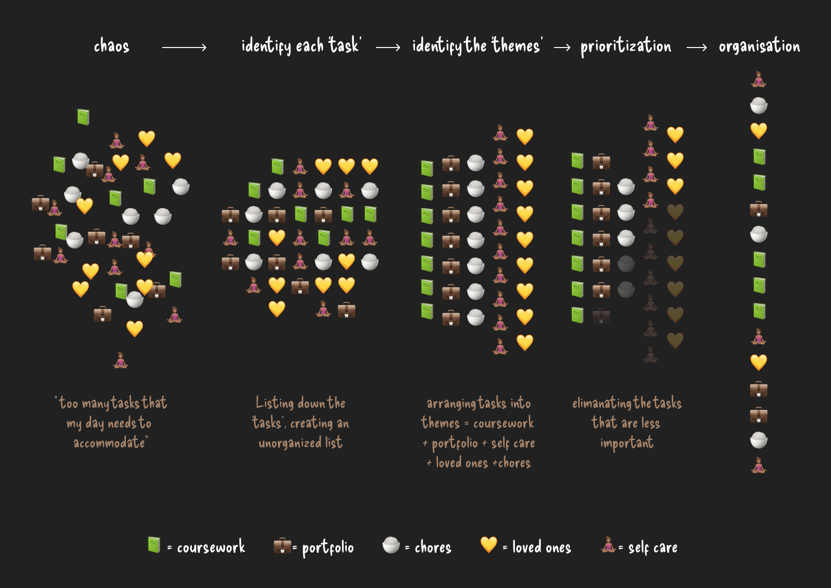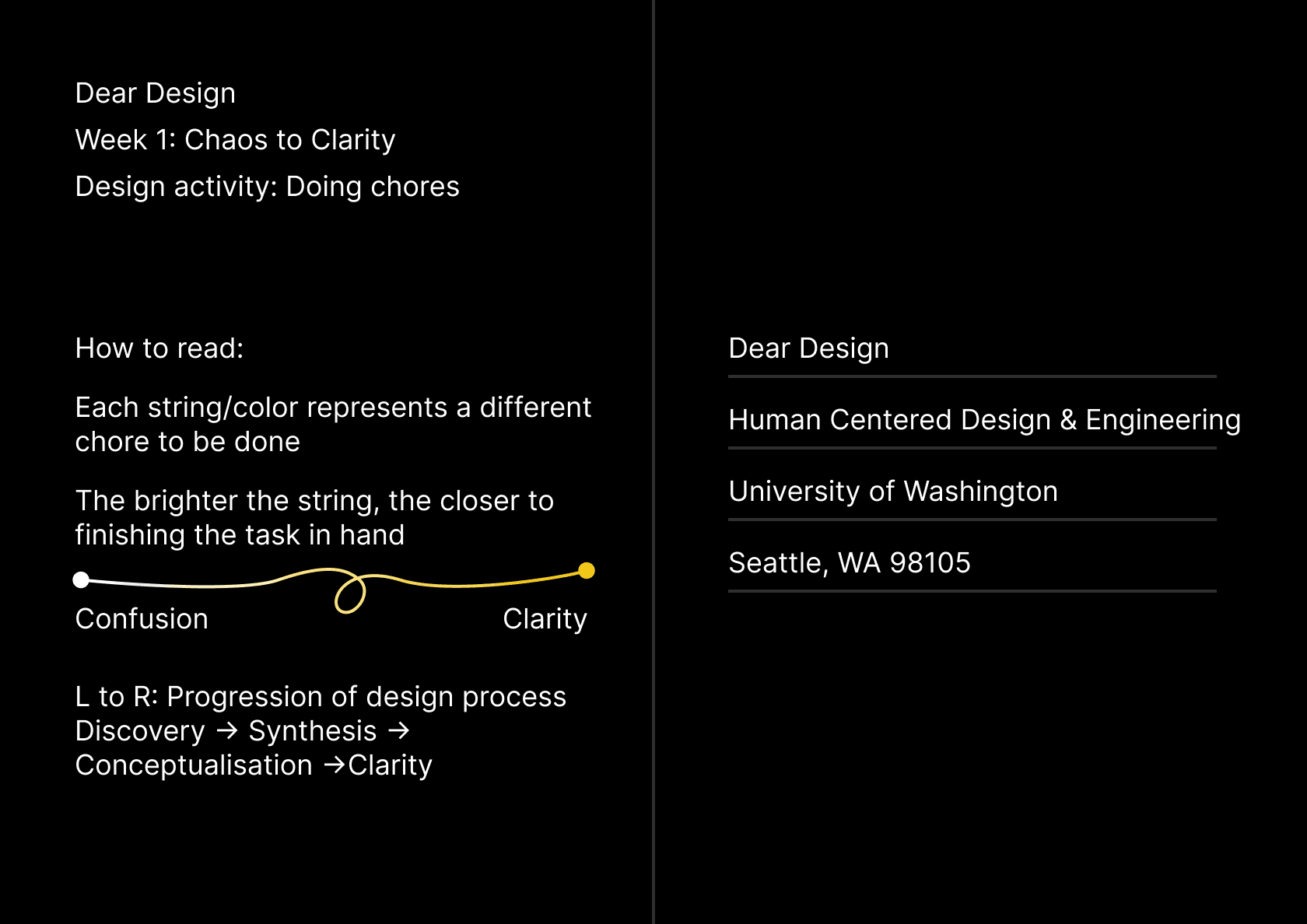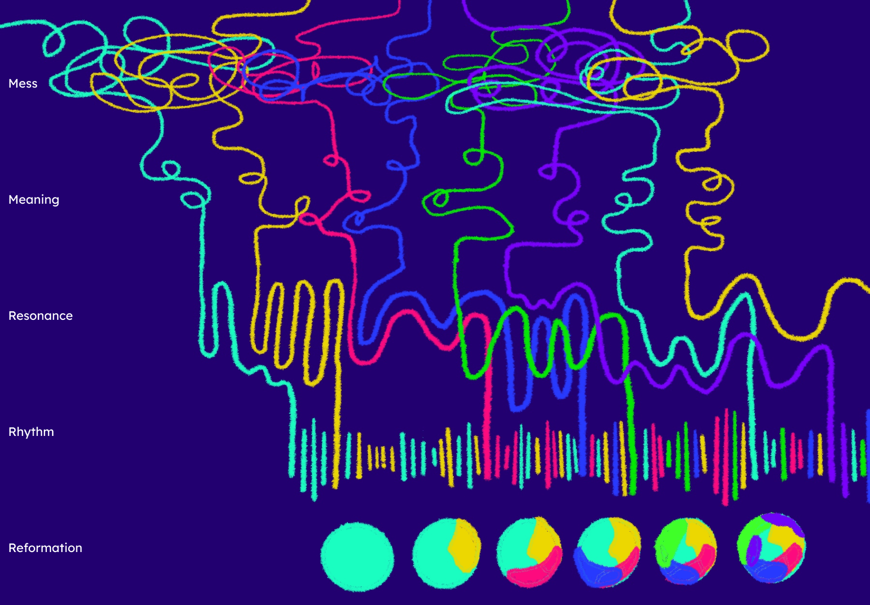 The final postcard is a collection of what process means to me and how it changes me as a designer. Initially, something that is messy is where we try to find meaning. Once we find the meaning, something that was once messy has now a language, a meaning of its own, like resonance. The key idea here is that when I am engaging in a process, I am not only changing or producing the outcome or the output, but the process is also changing me as a person.