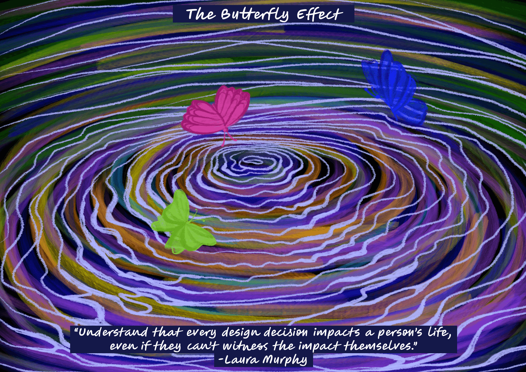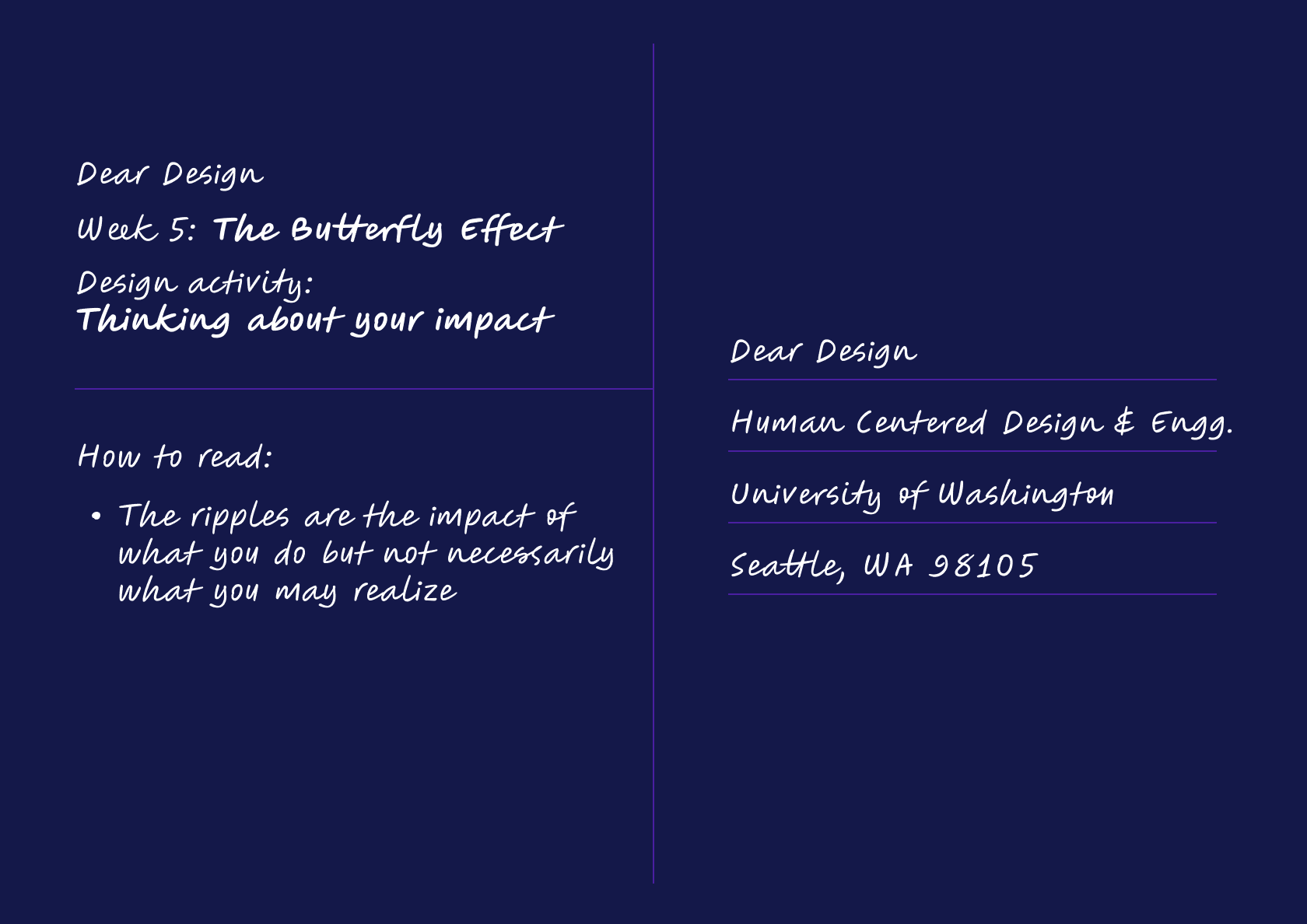 This postcard, rather abstract, is focused on the idea that every decision has an outcome and sometimes we may not be able to witness the outcome, but it still exists. So every decision that we take in the design process affects individuals when they are using the product that you have crafted. Therefore, being aware of the process that you engage and the outcome you are striving for is important.