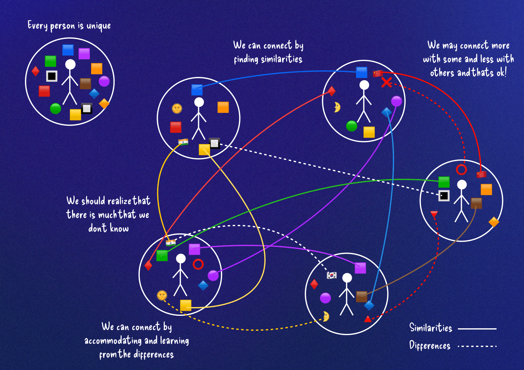 This postcard does not think only about the process, but us being a part of a bigger group. When we are engaging in a process, oftentimes we have to collaborate with multiple individuals. Each individual has their own story and we may find similarities and differences, but acknowledging that every person is unique is important to be cognizant of when carrying a process in a collective group.