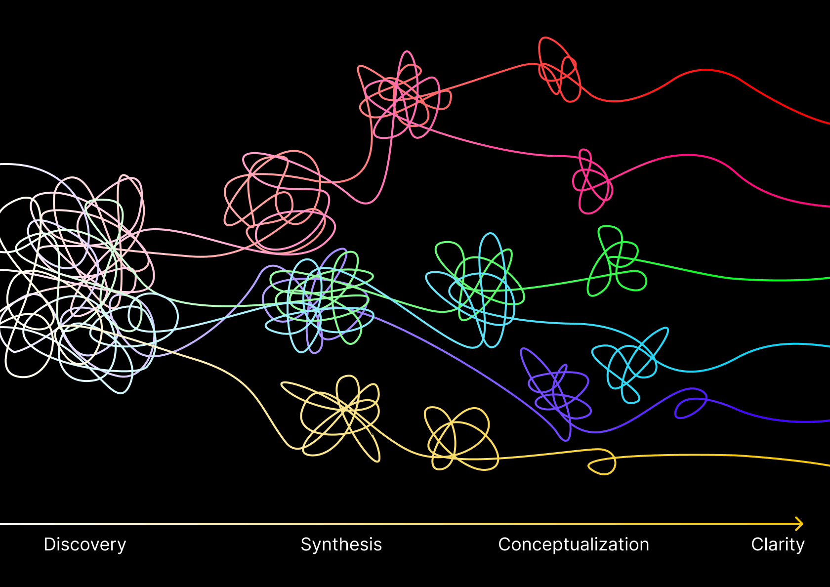This postcard views the process as a journey from chaos to clarity. It illustrates how initial ideas and thoughts, which may seem chaotic and jumbled, transform into distinct and organized concepts when engaged in a structured process. Each idea emerges with its own unique identity, represented by a "color of its own."
